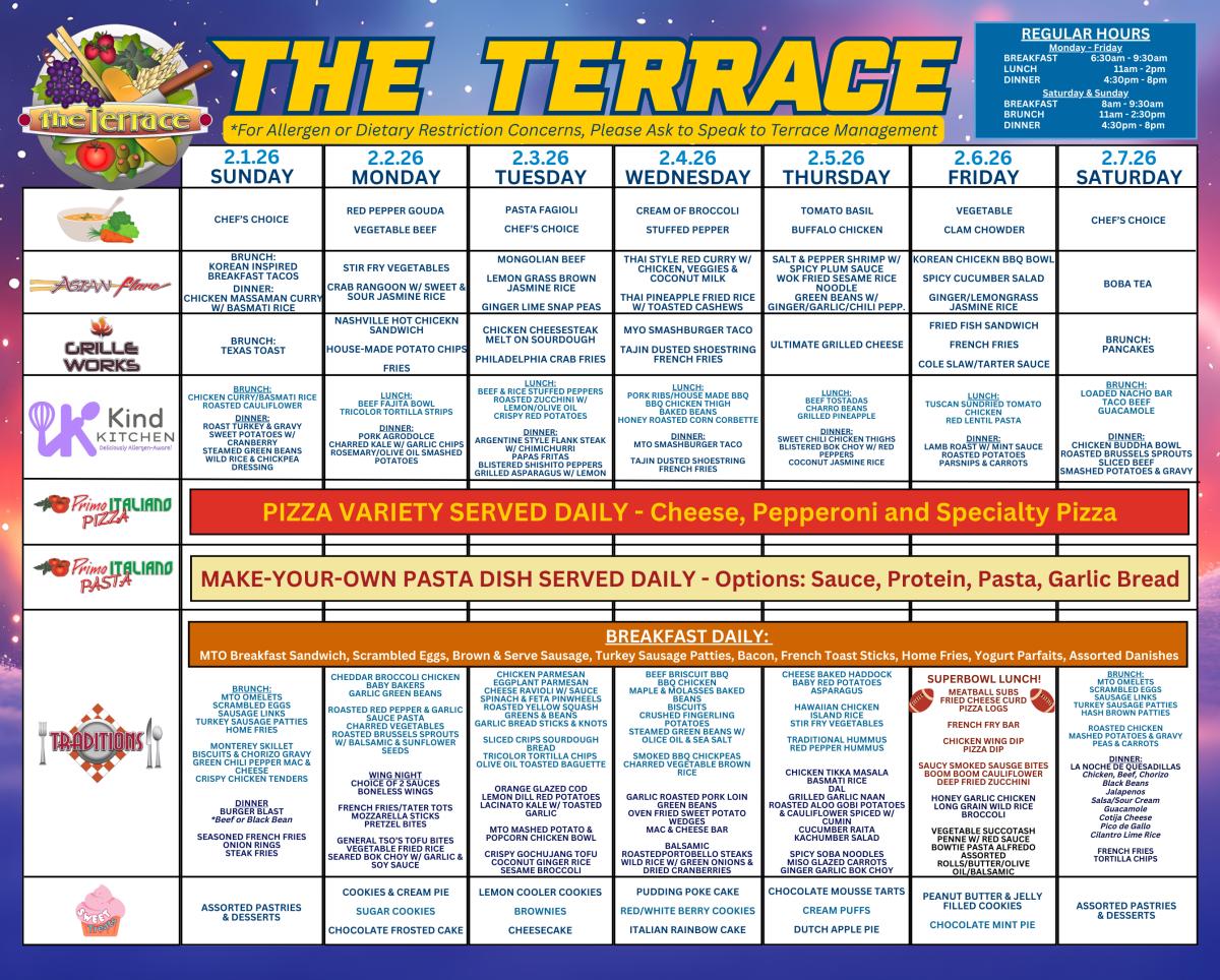 The Terrace serves up a world of flavor with something tasty for everyone! From allergen-friendly eats to dishes inspired by cultures around the globe, our menu celebrates variety and makes sure every student can dig into something delicious and satisfying.  Located on the 2nd floor of Central Dining Hall.