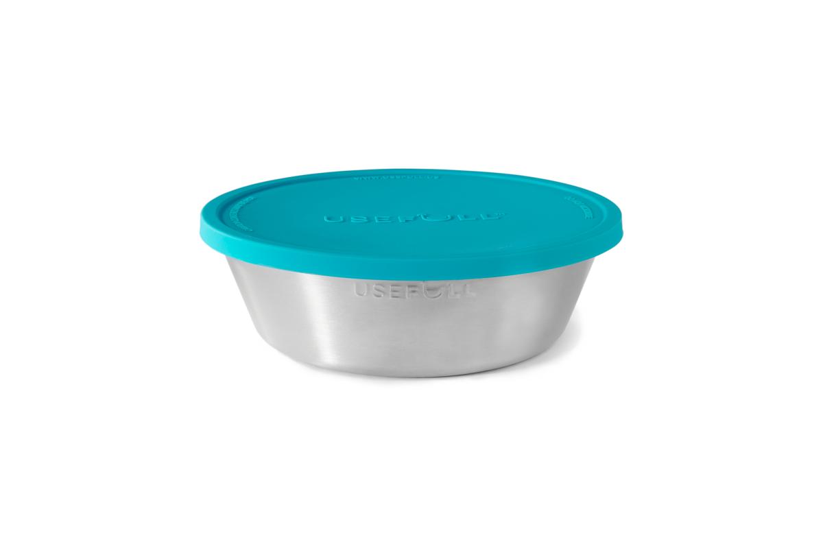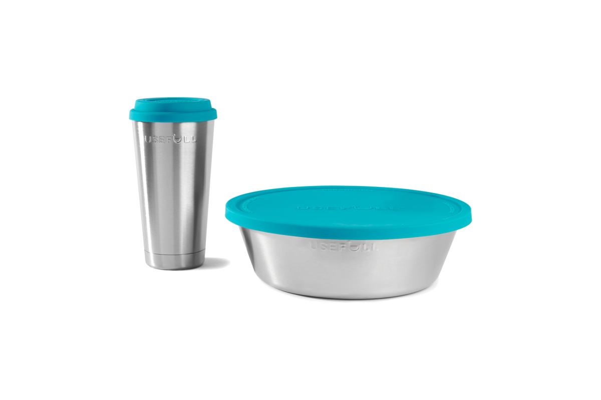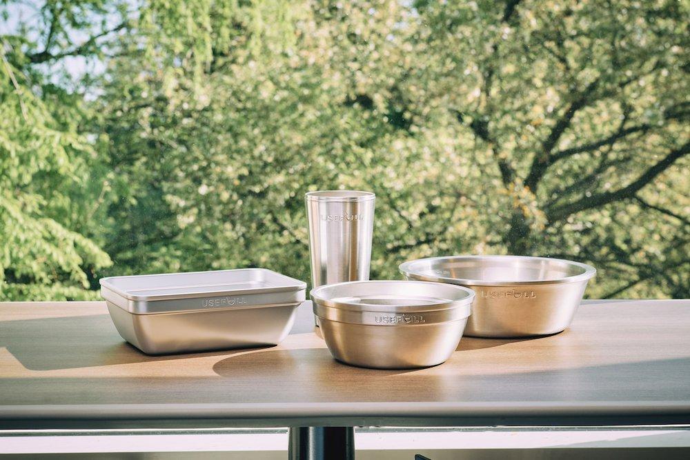 The plastic-free containers are made from recycled stainless steel with silicone lids.